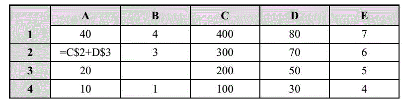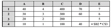 Дан фрагмент электронной таблицы. Из ячейки E4 в ячейку D3 была скопирована формула. При копировании адреса ячеек в формуле автоматически изменились. Каким стало числовое значение формулы в ячейке D3?
