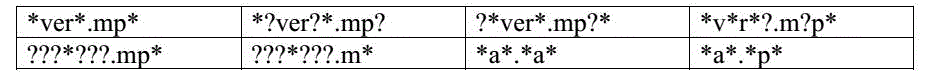 Для групповых операций с файлами используются маски имён файлов. Маска представляет собой последовательность букв, цифр и прочих допустимых в именах файлов символов, в которой также могут встречаться следующие символы.